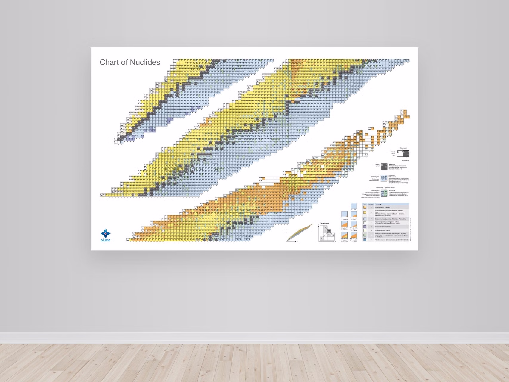 The blume chart of nuclides shows didactically optimized over 3,000 currently experimentally proven nuclides. The map provides over 10,000 highly precise data based on the well-respected National Nuclear Data Center of the Brookhaven Institute (USA). For teaching, studying and research in various departments, the great didactic value is in particular the readability optimized presentation of the data in interaction with the format adapted to the respective field of application.