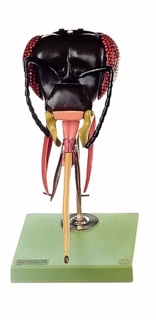 Honigbiene, Apis mellifera, im Maßstab 50:1 nach der Natur modelliert, aus SOMSO-Plast®. Nach Dr. E. Schicha. Die kauend-leckenden Mundwerkzeuge der Honigbiene sind dargestellt. Oberkiefer zur Demonstration der Funktion beweglich. In 2 Teile zerlegbar. Auf Stativ mit grünem Sockel.