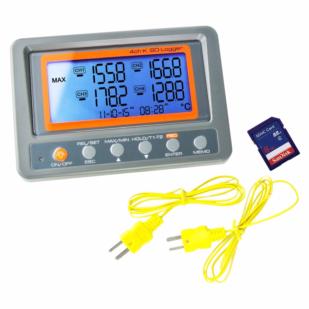 This 4-channel K Thermocouple SD Card Logger is the best tool for multiple measurements. It can record temperature changes by setting up data logging with no software required and no limit in memory. It has 4 reading displays with backlight and real-time clock feature. Beeper and LED alarming function are programmable from HIGH-LOW limit. The unit can be used by either wall-mount or handheld.