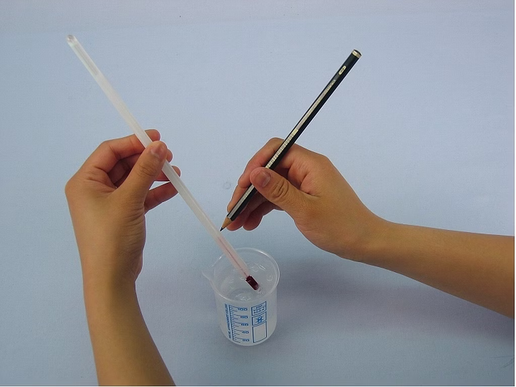 In the experiment, an ungraded thermometer is calibrated to the Celsius scale. To do this, the thermometer (without scale) is immersed in ice water. If the liquid level in the thermometer no longer changes, the level is marked. The thermometer is then immersed in boiling water. As in the first step, the height of the liquid level is now marked and the difference between the two marks is divided into 100 equal parts (one division then corresponds to one degree Celsius).