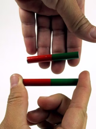 The students observe the attraction and repulsion of two magnets, examine the effect of unlike and like poles on one another and, furthermore, realise that the magnetic force may be greater than the weight of a magnet.