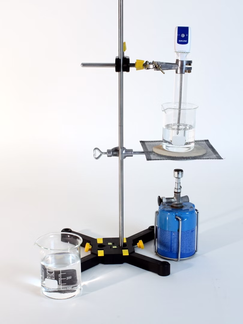 The students heat sodium thiosulfate until it melts and let it cool down again. In doing so, they measure the temperature curve as a function of time with a uniform heat supply or removal.