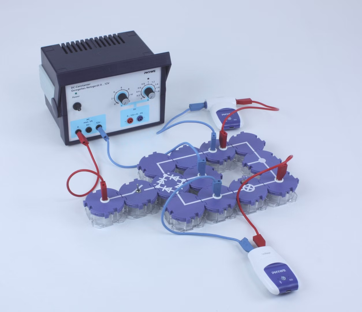 After the students have learned about the rectifier effect of a diode, this experiment should help them understand how the bridge circuit, which is primarily used in practice, works. They should learn that by using 4 diodes in a bridge circuit, it is possible to ensure that the current flows in the same direction through the working resistor during each half-cycle of the alternating current.