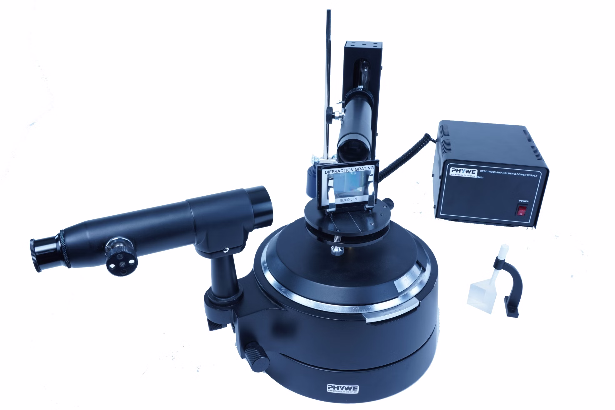 - Set up the spectrometer as a grating spectrometer and determine the grating constant using literature values for the visible spectral lines from a helium lamp.