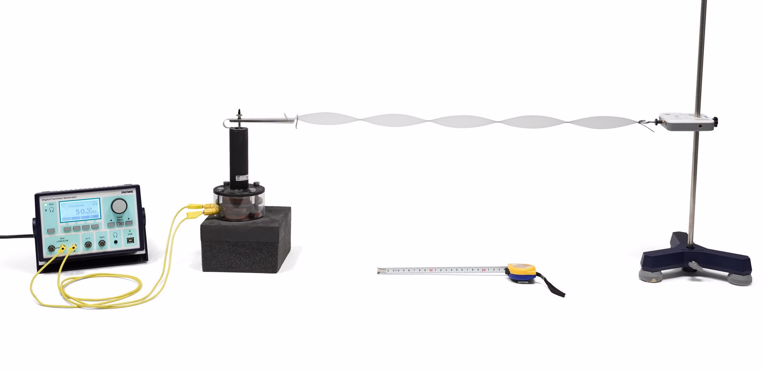 - The phase velocity c of the rope wave, which depends on the tensile stress of the rope, is to be measured. The phase velocity is displayed as a function of the tensile stress