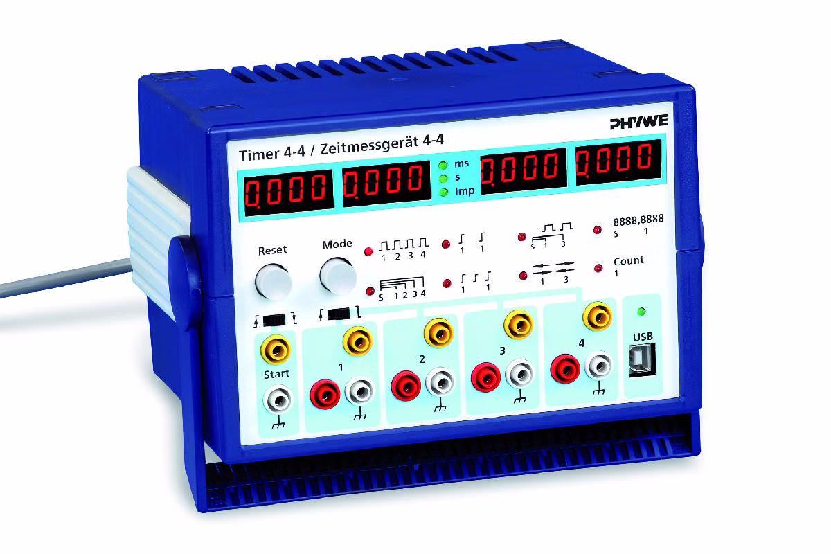 Measures up to 4 times simultaneously. Multiple time measuring instrument for a variety of applications in teaching, wherever times are to be accurately measured. The timer unit has four 4 digit displays. The starting and stopping of the four built-in independent timers is actuated by the opening or closing of electrical circuits, or by means of light barriers or other TTL signal sources (e.g. a microphone).