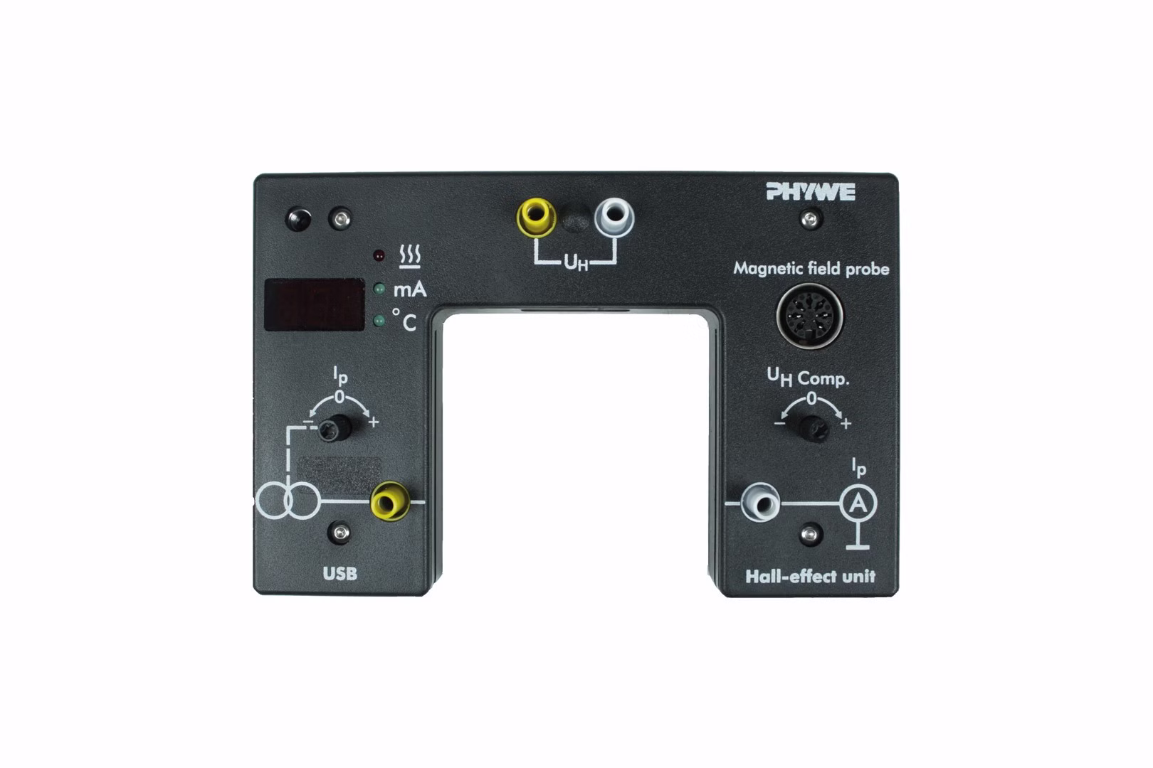 The Hall effect unit is used for holding and supplying Hall effect carrier boards with doped and undoped germanium crystals. It enables temperature-dependent measurement of Hall voltage and conductivity.