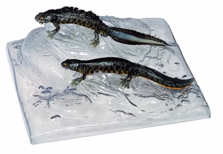 Triturus cristatus. Natural size in SOMSO-Plast®. After Christian Groß, Head of Biology Department (retired). On a green base with a transparent dust cover. Size of the box: