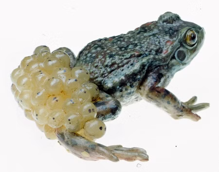 Alytes obstetricans. Natural size in SOMSO-Plast®. After Christian Groß, Head of Biology Department (retired). On a green base with a transparent dust cover. Size of the box: