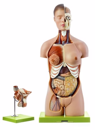 Natural size, in SOMSO-Plast®. As AS 4 but separates into 16 parts: eye, female thoracic wall, halves of the lung (2), heart (2), liver, stomach, small and large intestine, female (2) and male (4) reproductive organs, torso. On a green base. Height: torso 88 cm.