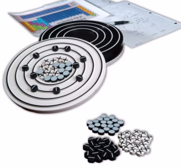 - Volumen de suministro: 2 modelos de demostración completamente magnéticos para el profesor (1 base negra para colgar, 2 núcleos atómicos blancos, 8 órbitas blancas, 20 protones, electrones y neutrones cada una) 8 modelos de ejercicio para el alumno (con 2 átomos, 30 protones, 30 neutrones y 30 electrones cada uno), instrucciones.