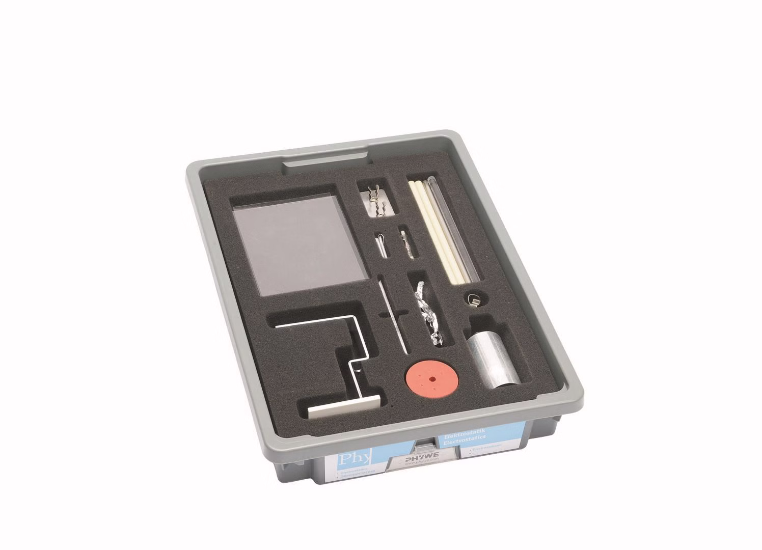 The equipment set consists of a storage box and contains all the basic components required to carry out the experiments. The sturdy, stackable box is equipped with a custom-fit foam insert that protects the components and enables a quick check for completeness.