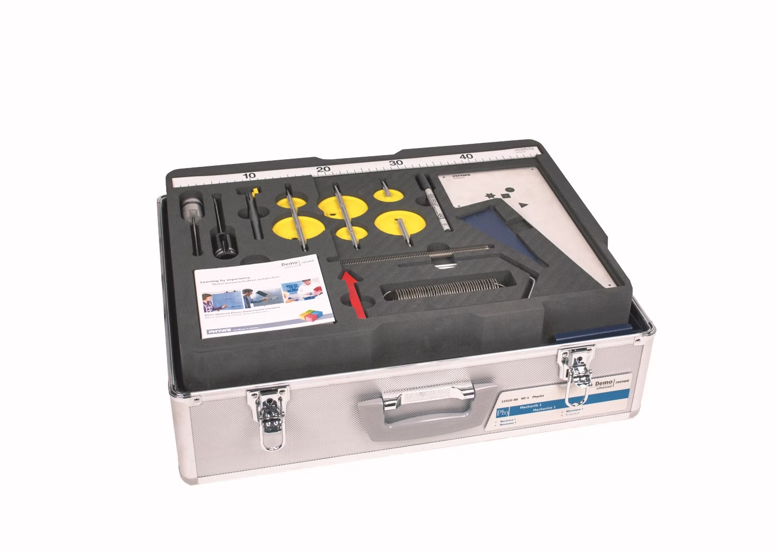 The equipment set consists of a storage case and includes all essential components required to carry out the experiments. The sturdy, stackable aluminum case is equipped with a precisely fitting foam insert that protects the components and allows a quick completeness check.