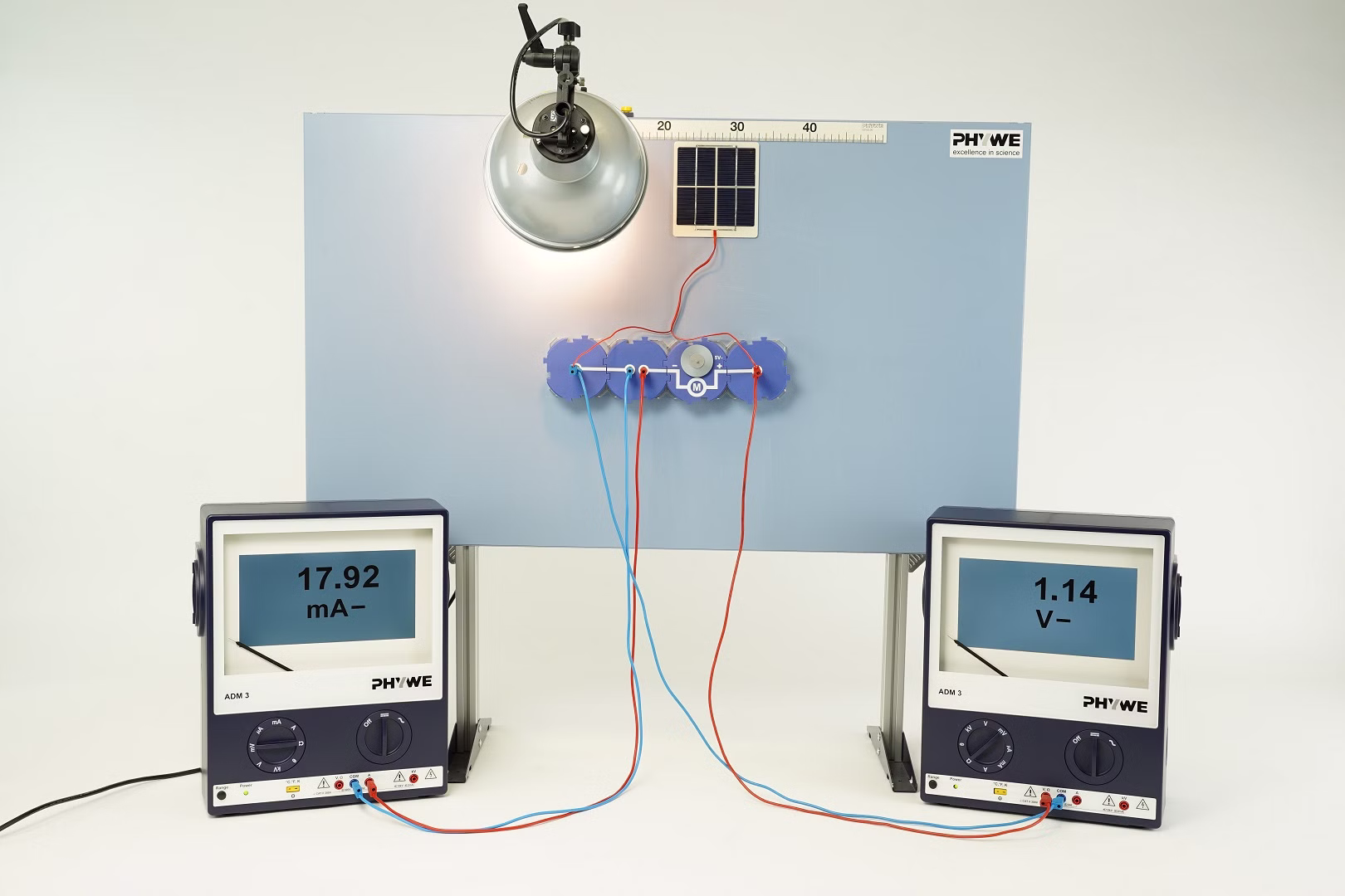 L'énergie solaire peut être convertie en énergie électrique à l'aide d'une cellule solaire. Il s'agit d'une forme d'énergie très importante, tant pour les ménages que pour l'industrie, car elle peut facilement être convertie en d'autres formes d'énergie telles que la chaleur, la lumière ou l'énergie mécanique (mouvement). Dans l'expérience, un petit moteur électrique est alimenté par une batterie solaire. L'expérience se compose de deux parties. Dans la première partie, la puissance électrique et le travail sont mesurés simultanément dans différentes conditions d'éclairage, de sorte que la relation entre les deux quantités peut être démontrée très clairement et évaluée quantitativement. Lorsque l'intensité lumineuse est élevée et la durée d'éclairage longue, les cellules solaires s'échauffent et leur puissance est réduite. Cet effet peut être montré dans la deuxième partie.