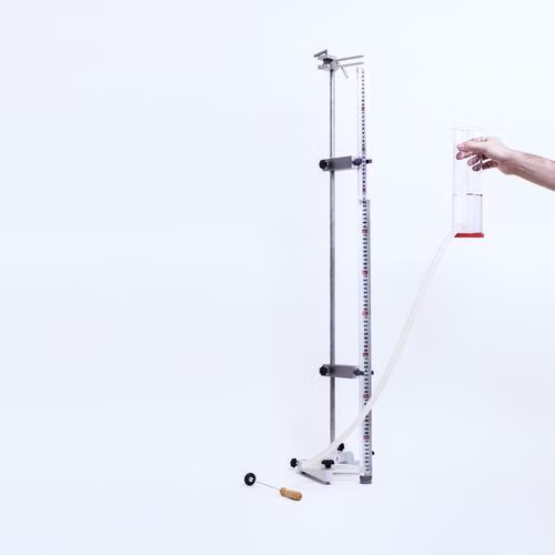 Le tube de résonance de Quincke (appareil de résonance) est utilisé pour détecter les phénomènes d'interférence sur les ondes sonores stationnaires. L'ensemble de l'équipement se compose d'un tube de résonance avec une échelle de mm, qui est partiellement rempli d'eau et relié par un tuyau à un réservoir d'expansion. La colonne d'air située au-dessus de l'eau est mise en vibration par un diapason (en option : haut-parleur). En relevant le vase d'expansion, on peut augmenter le niveau d'eau dans le tube de résonance et ainsi raccourcir la colonne d'air. L'onde sonore émise par la source sonore au-dessus du tube ouvert unilatéralement se superpose à l'onde sonore réfléchie à la surface de l'eau, ce qui entraîne une interférence constructive ou destructive. Des résonances audibles se produisent lorsque la longueur de la colonne d'air vibrante est égale à un multiple impair d'un quart de la longueur de l'onde sonore