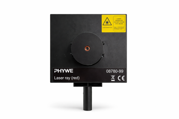 Technical data Laser ray (red)Article no: 08780-99 ![]() Function and Applications The red laser beam (laser class 1) is suitable for safe use in schools and classrooms. It is used to demonstrate beam paths and optical experiments. Vertical fine adjustment via a set screw allows precise alignment. Powered by a mains adapter with an on/off switch on the rear. Height-compatible with 09880-00 and 08390-00. Benefits