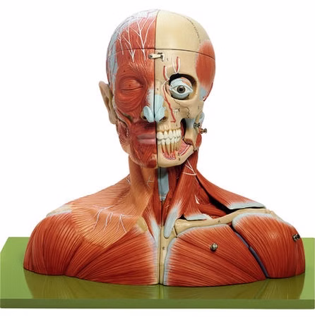 Натуральный размер, в SOMSO-Plast®. С правой стороны показана мимическая мышечная система с глубоко расположенными мышцами. Левый височно-челюстной сустав и грудино-ключично-сосцевидная мышца снимаются, чтобы показать сонный тригон. Может быть разделена медиально на две половины. После снятия черепа можно извлечь 8 частей мозга с артериями. Разделяется на 19 частей: Трапециевидная мышца, основная грудная мышца, дельтовидная мышца и ключица, глаз с мышцами и зрительным нервом. На зеленом основании.